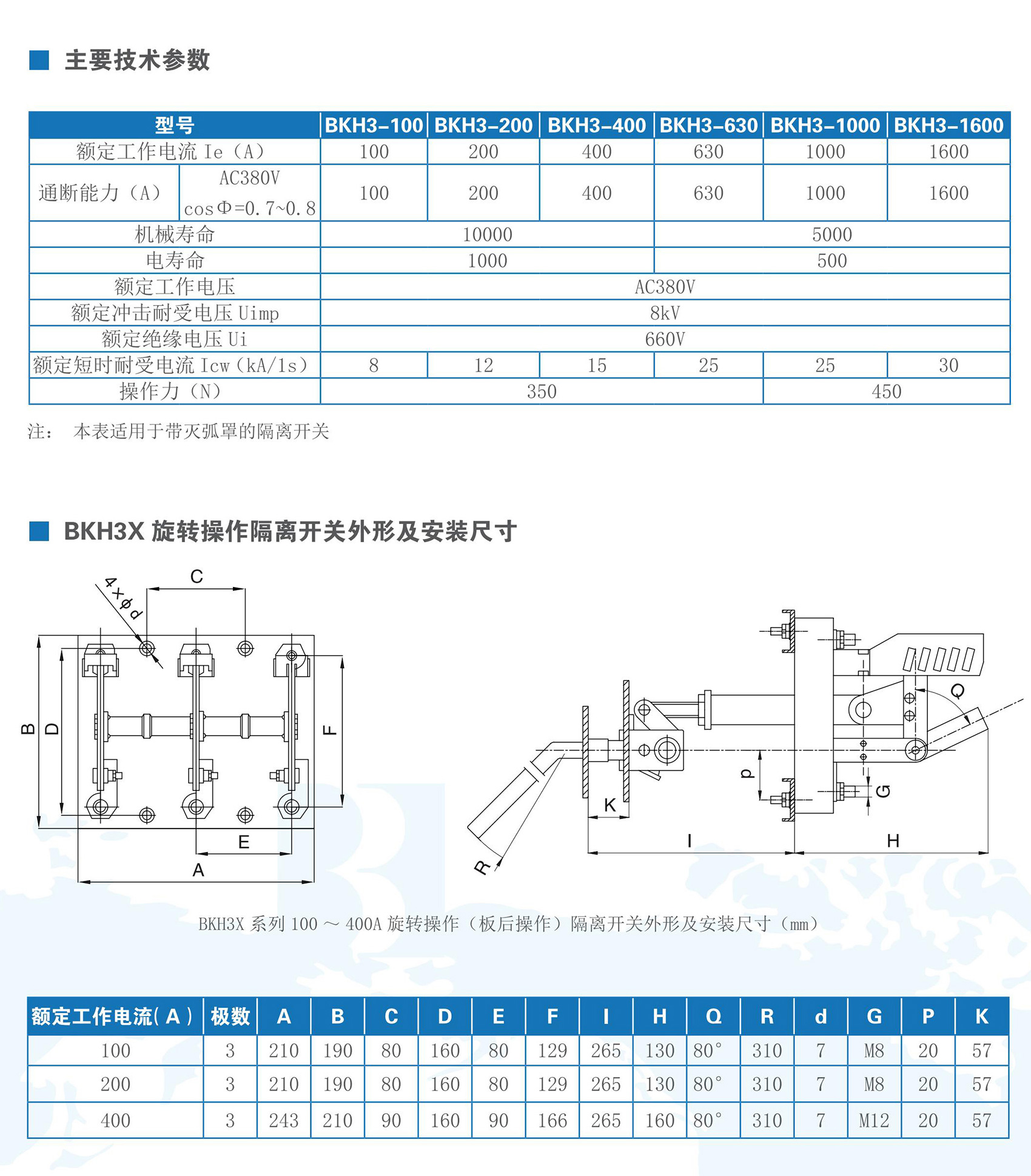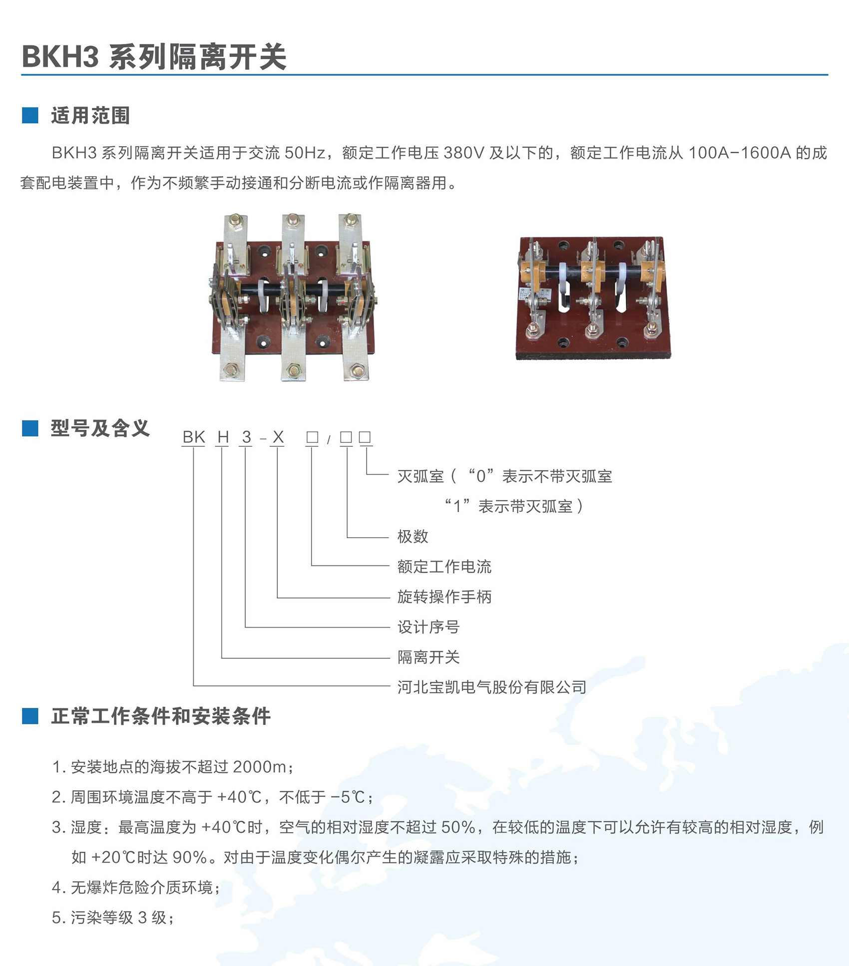 BKH3系列斷絕開關合用于交換50Hz,額外任務電壓380V及以下,額外任務電流100A-1600A的成套配電裝配中,作為不頻仍手動接通和分斷電流或作斷絕器用。BKH3系列斷絕開關合適GB/T 14048.3《高壓開關裝備和節制裝備高壓開關、斷絕器、斷絕開關及熔斷器組合電器》。