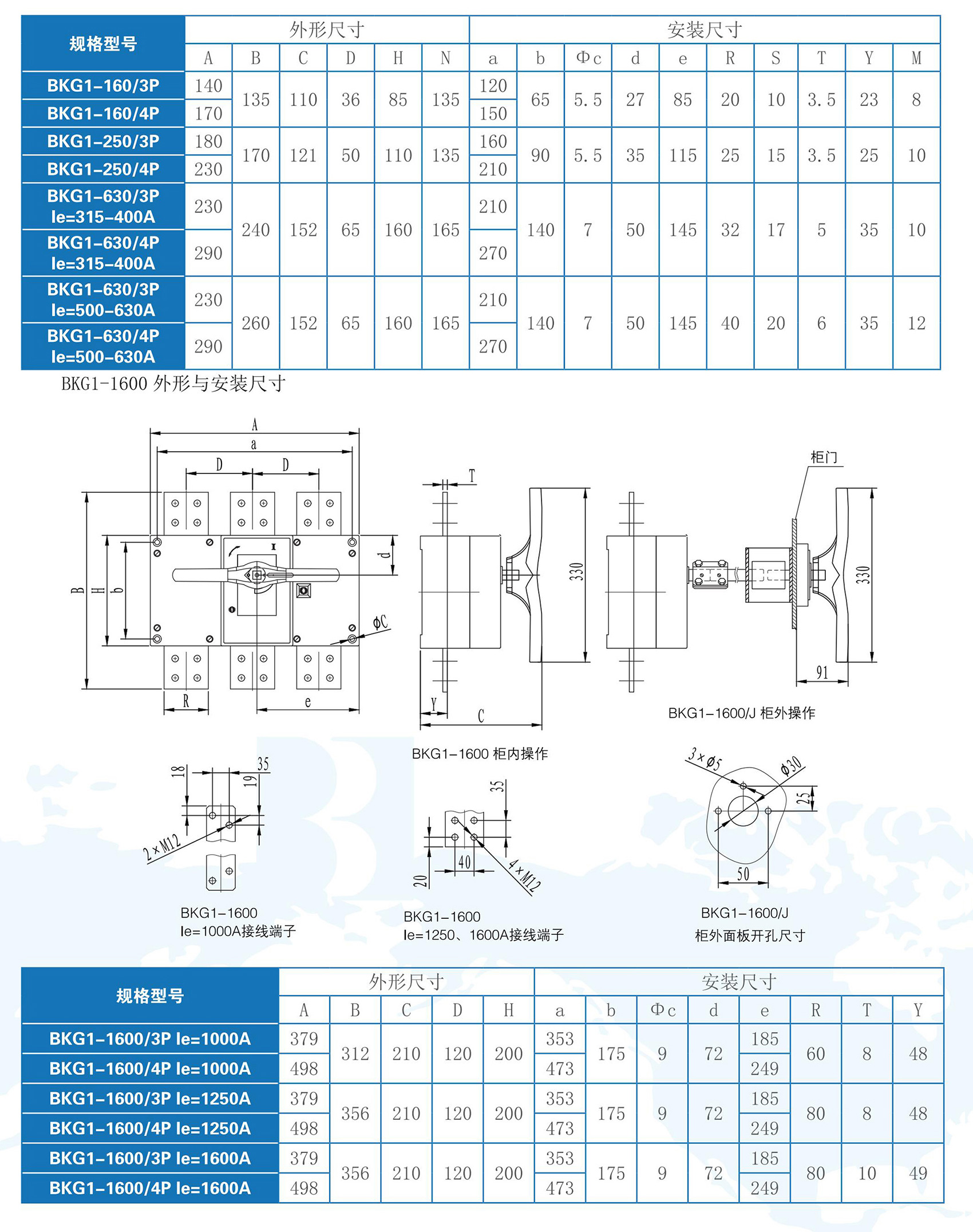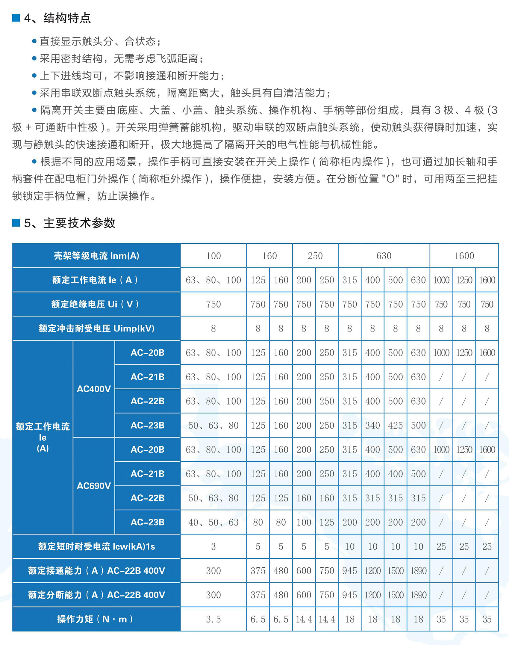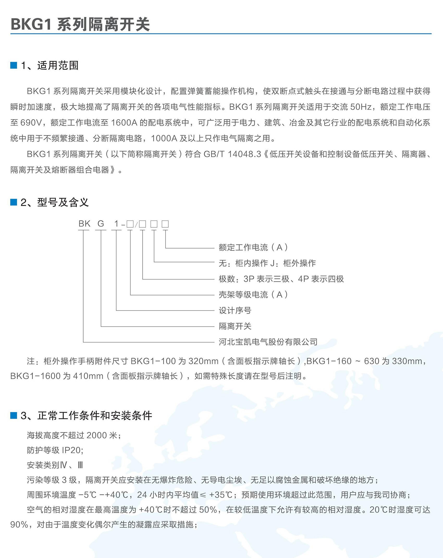 BKG1系列斷絕開關合用于交換50/60Hz,額外任務電壓至AC690V,額外電流為1600A及以下的電力體系中,可普遍用于電力、修建、冶金及其它行業的配電體系和主動化體系頂用于不頻仍接通、分斷和斷絕電路之用,額外任務電流1000A及以上產物,只作電氣斷絕之用。BKG1系列斷絕開關合適GB/T 14048.3《高壓開關裝備和節制裝備高壓開關、斷絕器、斷絕開關及熔斷器組合電器》。