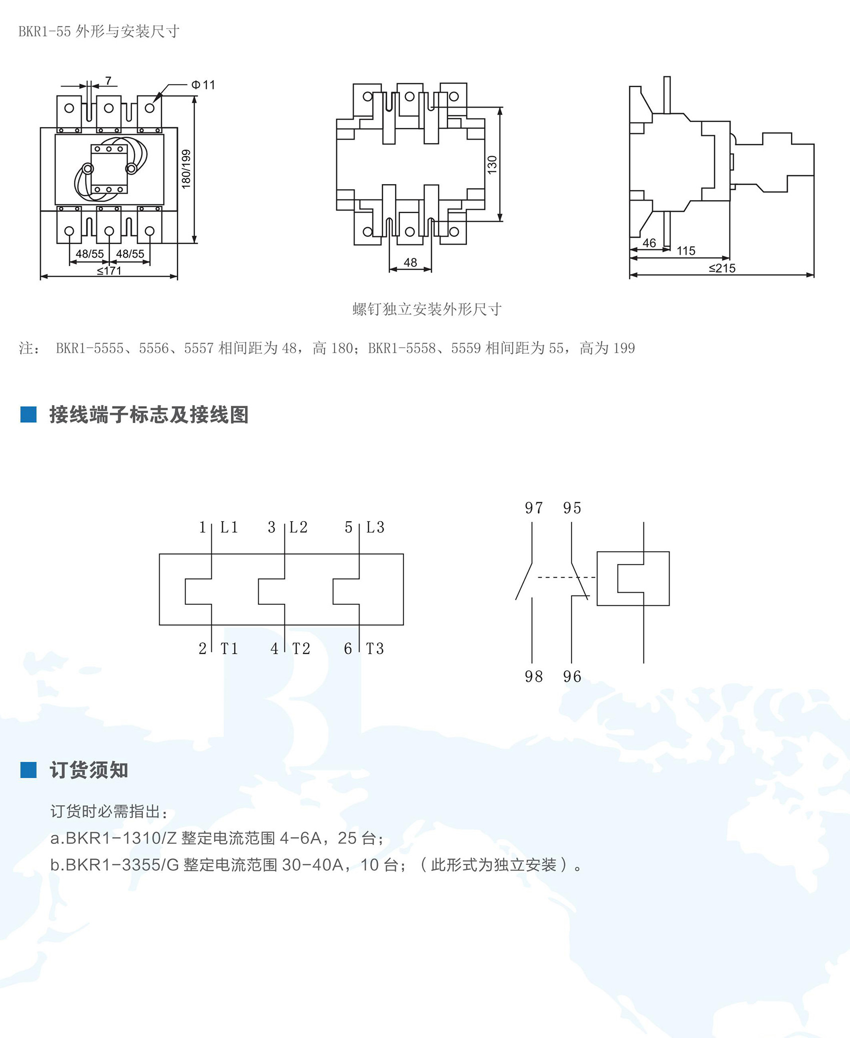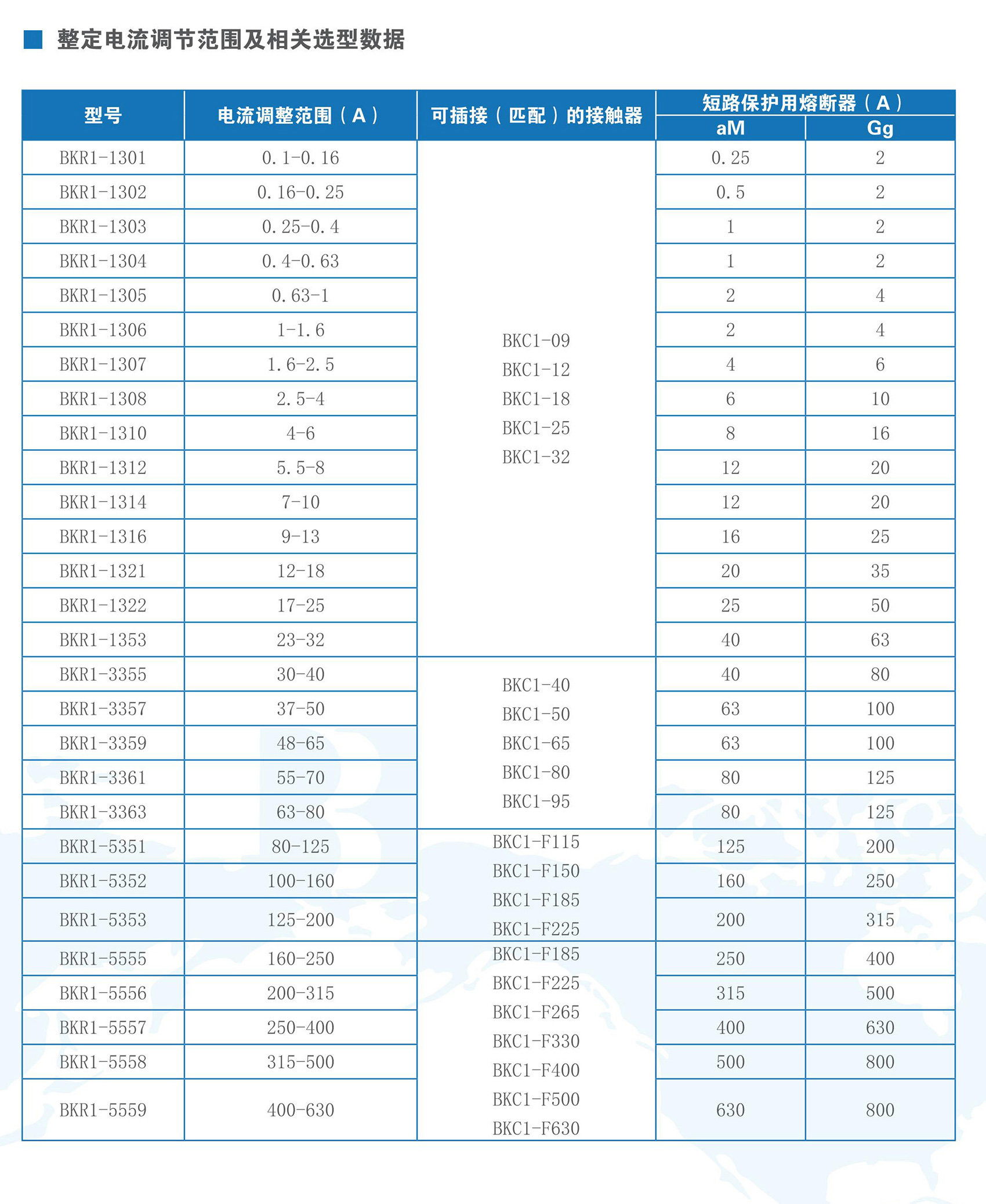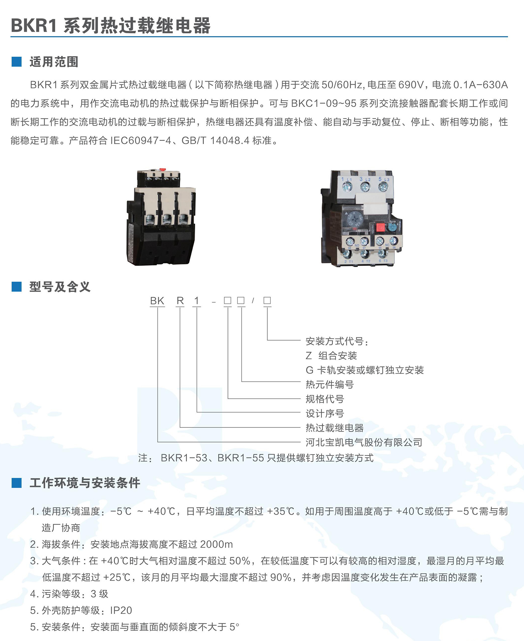 BKR1系列熱過載繼電器,在交換50Hz(60Hz)、額外電壓至690V、電流0.1A至630A的電路中,作三相交換電念頭的過載和斷相掩護之用。熱過載繼電器具備溫度彌補、舉措唆使、主動和手動復位、遏制等功效,機能不變靠得住。產物合適IEC 60947-4、GB/T 14048.4、GB/T 14048.5規范。