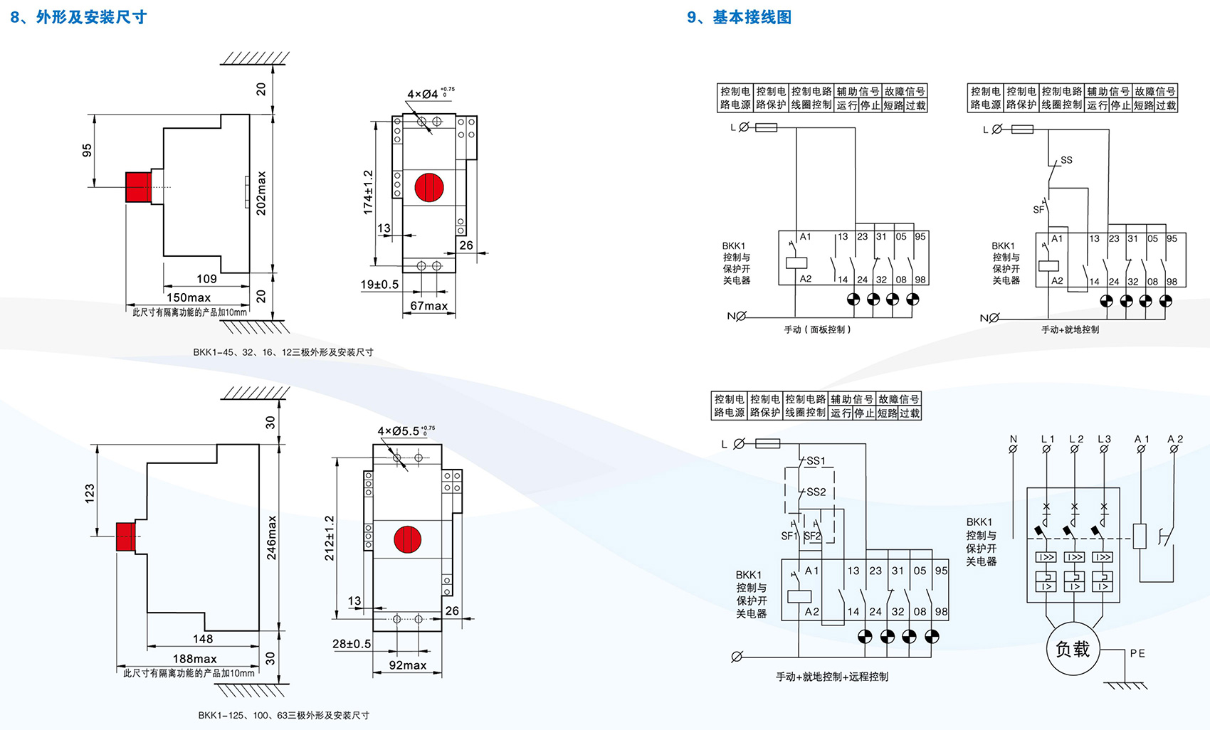 BKK1系列節制與掩護開關電器首要用于交換50Hz(60Hz)、額外電壓至690V、額外任務電流自0.4A至125A的電力體系中接通、承載和分斷一般前提(包含劃定的過載前提)下的電流,且能夠或許或許接通、承載并分斷劃定的非一般前提(如短路)下的電流。BKK1系列接納模塊化的單一產物布局情勢,集成了傳統的斷路器(熔斷器)、打仗器、過載(或過流、斷相)掩護繼電器、起動器、斷絕器、機電綜合掩護器等多種傳統的分手元器件。產物具備遠間隔主動節制與當場人力節制兼有的體例停止節制操縱的功效,具備調和共同的時候-電流掩護特征,具備節制與掩護自共同、短路后持續運轉,具備分斷才能高,飛弧間隔小、壽命長,具備掩護整定電流都可調的特征,操縱便利、配套模塊多樣齊備等長處,能夠或許完成對電念頭負載、配電負載的節制和掩護。產物合適GB/T 14048.9《節制與掩護開關電器》規范。
