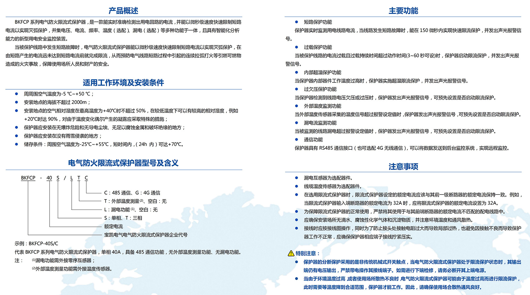 BKFCP系列電氣防火限流式掩護器,是一款能及時精確檢測出用電回路的電流,并能以微秒級速率疾速限定短路電流以實現滅弧掩護,并集電壓、電流、頻次、溫度(選配)、泄電(選配)等多種功效于一體,且具備智能化闡發才能的新型用電寧靜監控裝配。當被掩護線路中發生短路毛病時,電氣防火限流式掩護器能以微秒級速率疾速限定短路電流以實現滅弧掩護,在由短路發生的電流遠未到達短路電流前就實現限流,從而防備電氣線路短路進程中引發的持續拉弧打火等引燃可燃物形成的火警變亂,保證利用場合職員和財產的寧靜。